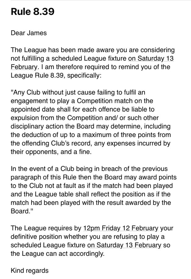 Dulwich Hamlet, Curzon Ashton & Chippenham Town have all confirmed that they've been charged by the National League failing to fulfil league fixtures this week. Southport & Concord Rangers are among clubs who've been warned that they could forfeit fixtures if they do not play.