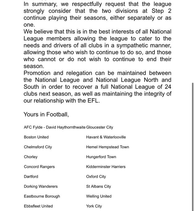 “We respectfully request that the League strongly consider that the two divisions at Step 2 continue playing their seasons, either separately or as one.” 18 clubs across the National North & South have written to the General Manager of the National League. [/url] [url=]