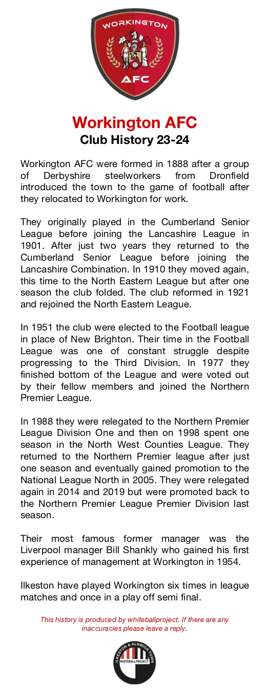 The last time we played against Workington at home was as Ilkeston FC on 19 Nov 2016 when Workington won 2-0. At the end of that 2016-17 season we went into administration and Ilkeston Town FC was re-born under Alan Hardy’s ownership.