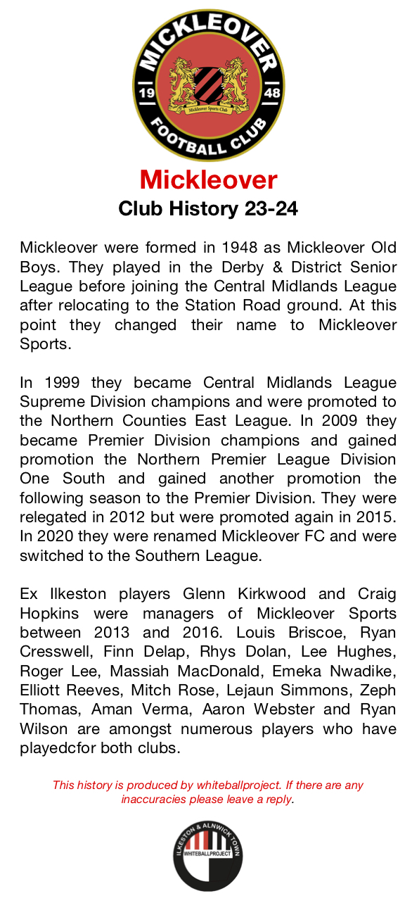 Big test today for manager Gary Hayward. After 3 defeats can he turn things round? Playing against unbeaten Mickleover will be a real challenge because so far Mickleover have won all 6 of their Southern League Premier Central matches. There will be plenty of support coming from Ilkeston and Mickleover are expecting a bigger than normal gate so it should be a great atmosphere.