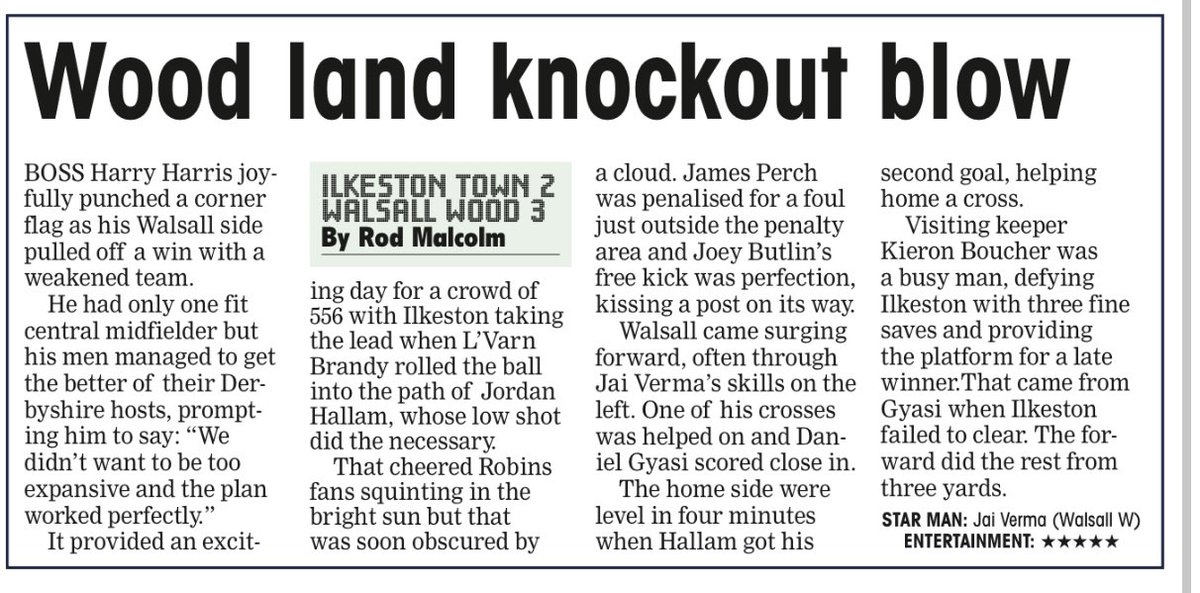 I would say disappointing rather than awful. We didn't defend as well as in previous games. Wood took the game to us and caused us plenty of problems especially their number 7 Jai Verma. It was a game that could have gone either way and we had our chances before Walsall Wood's late winner. Their keeper Kieron Boucher produced at least three outstandng saves in the second half.
