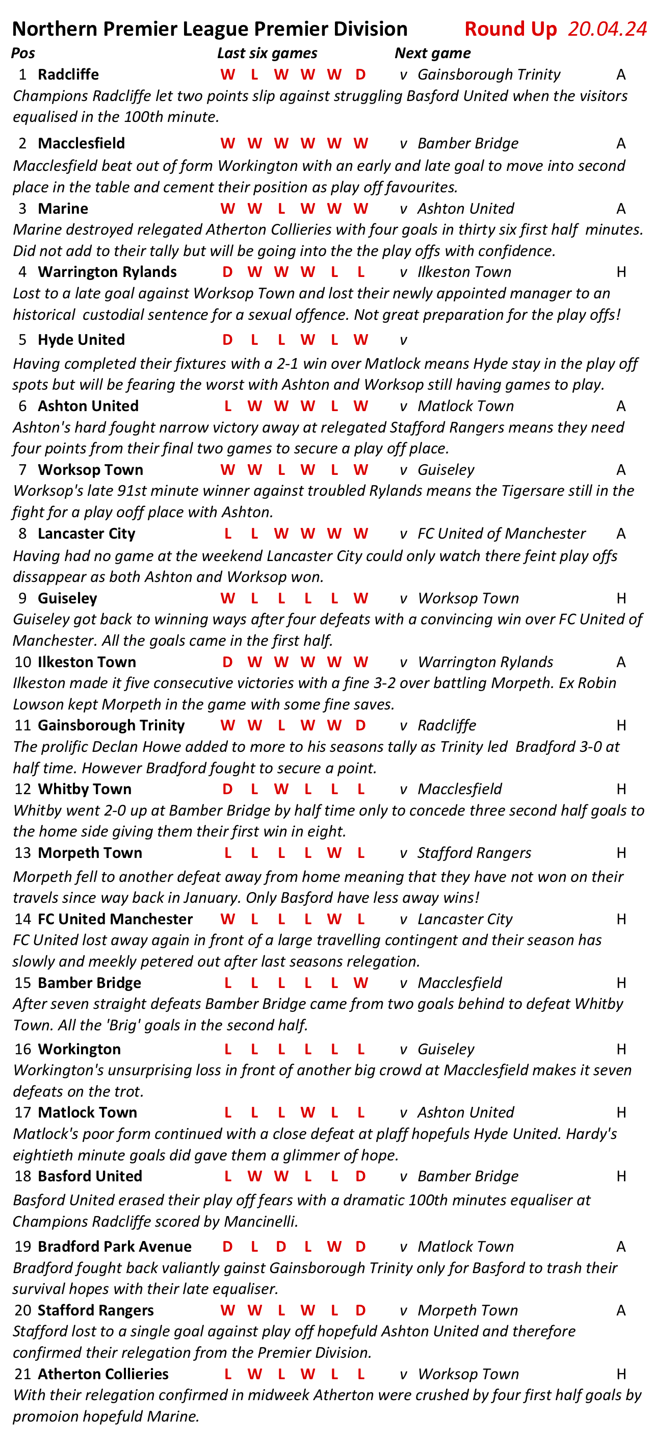 At the bottom of the table Basford, Stafford and Bradford continue their fight to avoid the drop. We may have to wait until the final Saturday to see which team survives.
