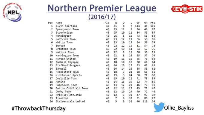 Each Thursday I share a different historical non-league table. Here's the Northern Premier League table from 2016/17. Blyth Spartans & Spennymoor Town (playoffs) were promoted. Corby Town, Frickley Athletic, Ilkeston & Skelmersdale United were relegated.