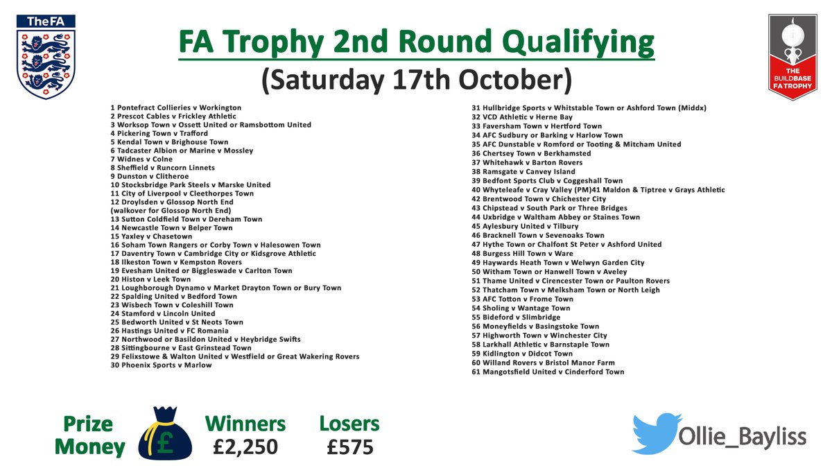 The FA Trophy 2nd Qualifying Round has been published. Games to take place on Saturday 17th October.