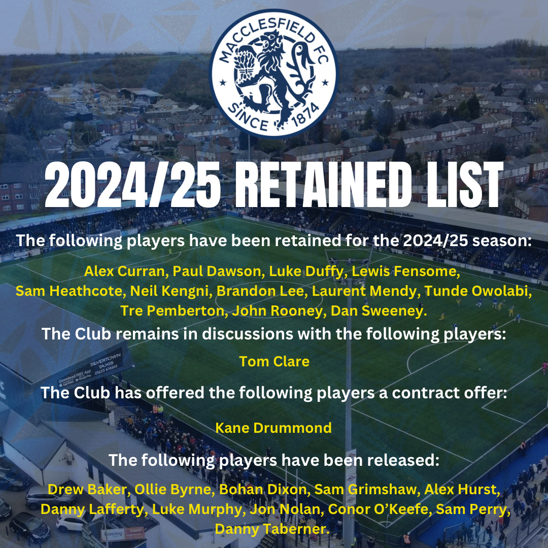 Macclesfield FC can confirm our retained and released list ahead of the 2024/25 season. We would like to thank departing players for their effort whilst wearing a Macclesfield shirt