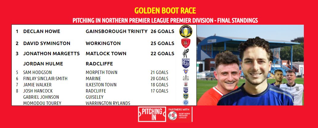 The Premier Golden Boot was in @Matlock_TownFC's Margetts hands before his transfer but @GainsTrinityFC's Howe takes the prize against @WorkingtonAFC's Symington whilst @radcliffeboro's Hulme ties with Margetts for 3rd