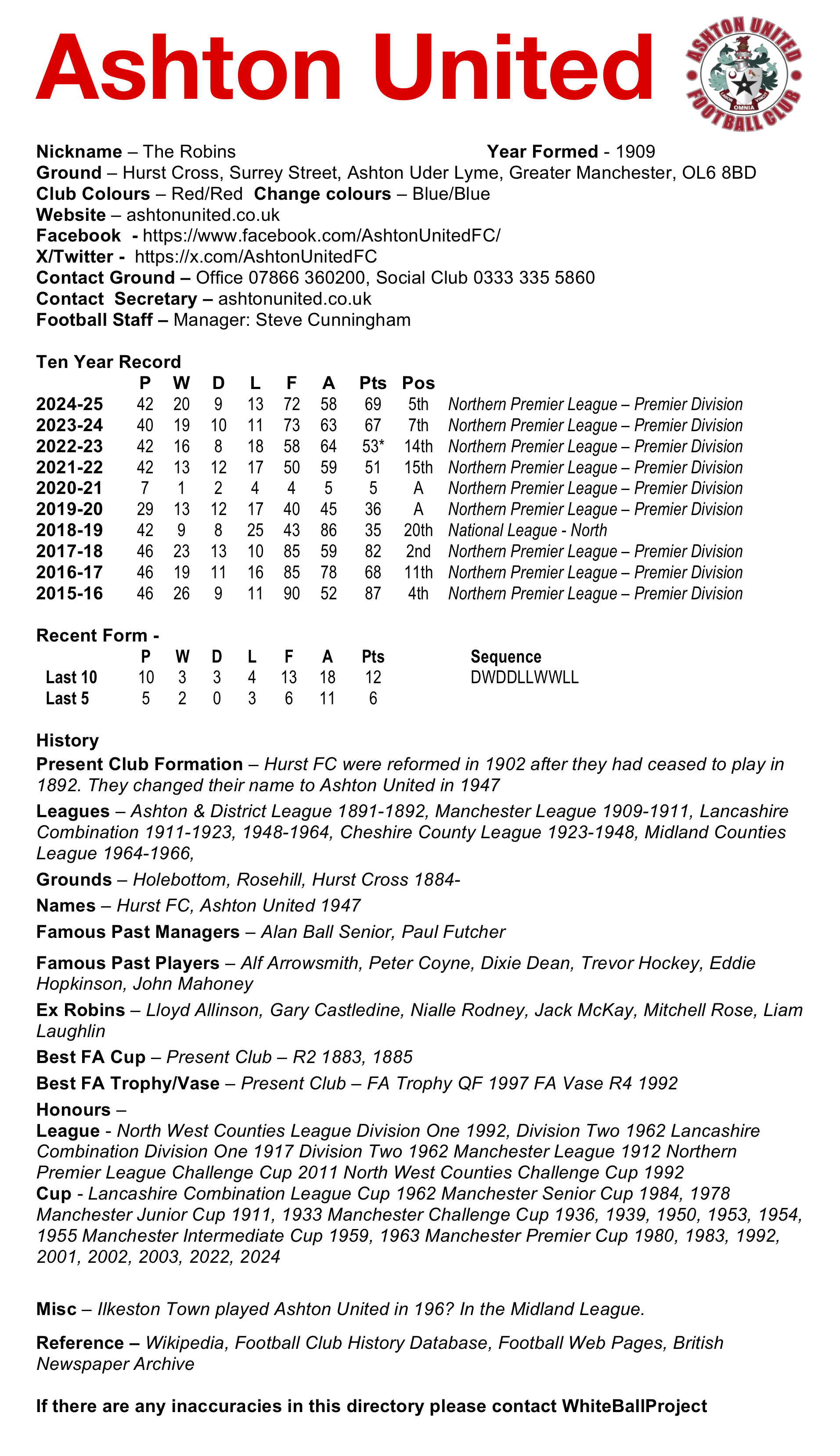 Our opponents this Saturday, Ashton United, made the playoffs last season. This season they are currently mid table afer losing their last two games. Last Saturday they suffered a 4-0 home defeat to Cleethorpes so they will be keen to bounce back from that humiliation.