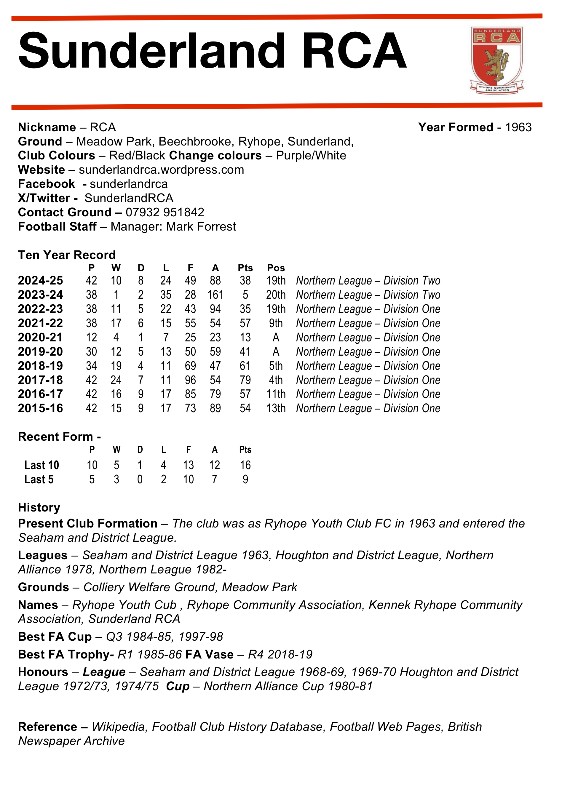 After their excellent win on Tuesday against Sunderland West End Alnwick Town take on their neighbours Sunderland RCA away on Wearside. Alnwick are now second in the table and are starting to be recognised as real promotion candidates. I looked at their formation on Tuesday night and realised they play a 5-4-2 formation with attacking full backs Egglestone and Bright providing the thrusts down each flank. The defence of ant three from Shepherd, Iley, Cherry or Wilkinson are solid at the back whilst Patterson, Shell and Aziakonou providing the industry in midfield. Up front Potts has hit rich vein of form and cant stop and he was supported by new signing Smith, Anderson and the injured Clark and Aghostini. However Alnwick have a very strong squad and have players on the sidelines who can easily fill in like Baston, Walker and Dobie. All in all it os looking very promising for Alnwick Town so far.